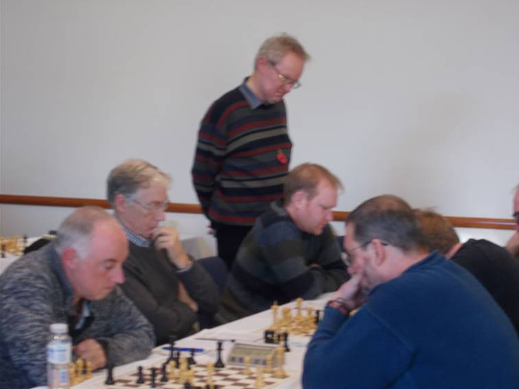 Dave Patrick (Calderdale), Harry Baxter (Alwoodley) and Damian McCarthy (Calderdale) in round 2, playing for Bradford DCA Knights B, watched by fellow team member Paul Johnson (York)