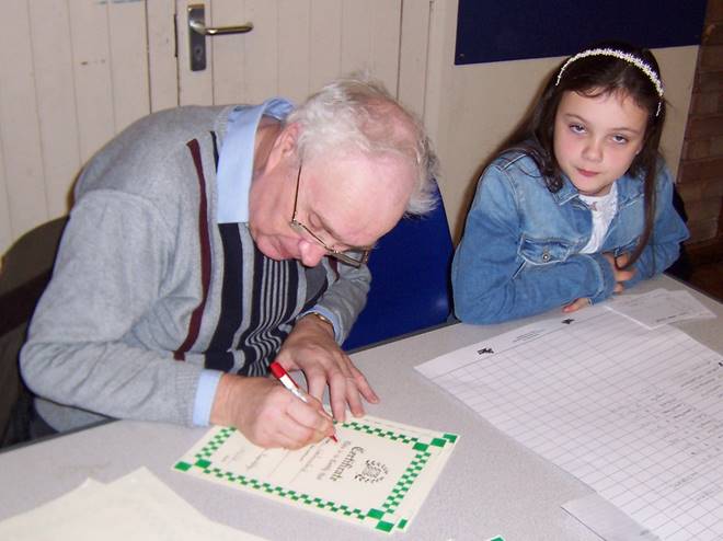 Peter Cloudsdale writes out Certificates, under the close supervision of his assistant, Olivia Westmoreland.